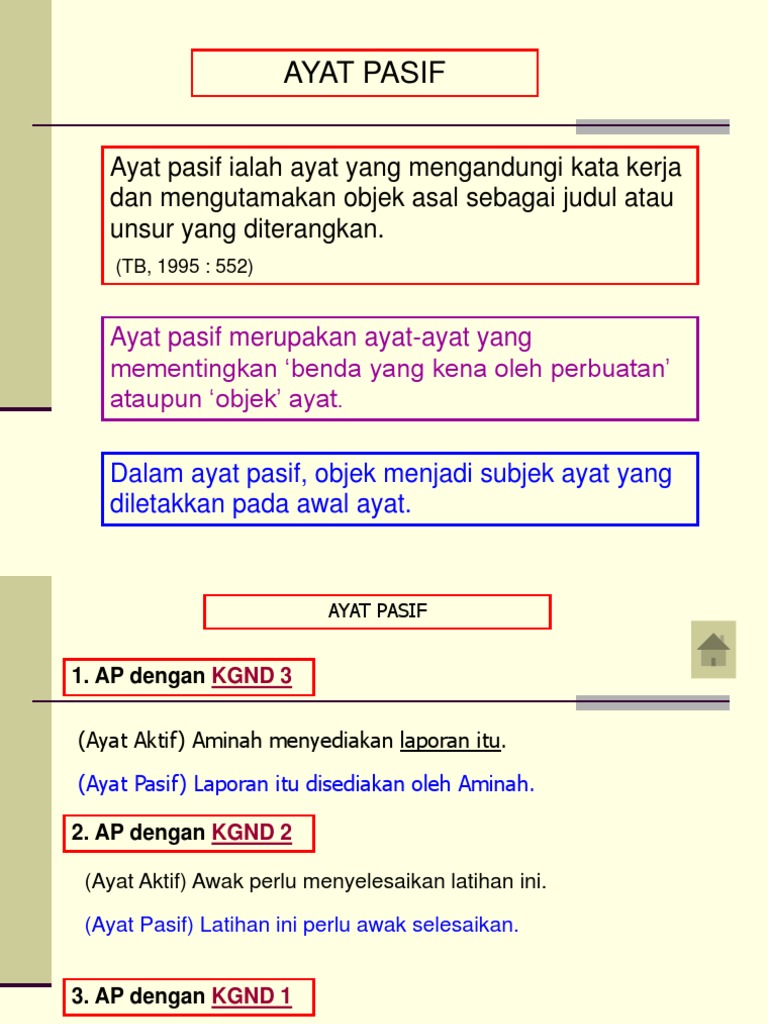 Ayat Pasif menerangkan benda atau orang yang dikenakan perbuatan ke atasnya. Tetapi hanya ayat aktif transitif dapat dipasifkan. Kata kerja tanpa imbuhan diri pertama dan kedua ii.